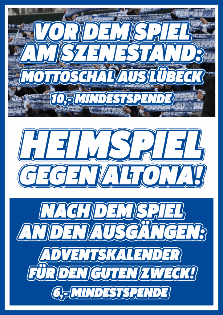 Spendensammlung & Adventskalender für den guten Zweck! Nach dem Spiel sammeln wir an den Ausgängen zur Jahnstraße und zur Lathener Straße Spenden und geben (solange der Vorrat reicht) einen SUPER SV MEPPEN Adventskalender gegen 6 € Mindestspende heraus. Die Erlöse aus der Spendensammlung gehen ans Frauen- und Kinderschutzhaus vom SkF Meppen!